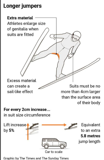 Ski jumping is the dumbest sport out there. There are points for style which is arbitrary and already takes it down couple of levels compared with real sports. Weight is super important so the ‘athletes’ are all starving all the time. Wind has a big influence so they have to guess when gust will happen but since it changer during the day judges will arbitrarily change the length of runway at different points of the competition. It’s barely fair. And on top of that the suit has such a huge influence that the jumpers can’t even touch it after they were certified. Like they literally can’t touch the suit they are wearing because just changing how it adjust to the body will affect the score. And now we learned that adding 1cm to the length of the suit have such a big influence that they will inject stuff in their dicks to get an advantage. This ‘sport’ is more about starving yourself, having luck and finding ways to cheat the rules then it is about athleticism.