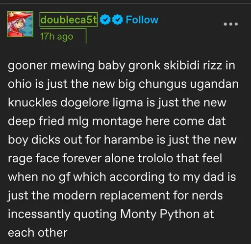 My favorite piece of text from a few years ago that I was disgusted to be able to parse was “Shrimp cereal Topanga husband is a Me Too milkshake duck.”