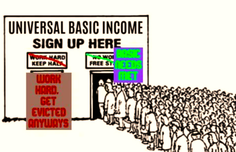 The fundamental problem with UBI is that landlords will still evict your ass as soon as they find a way to squeeze more rent out of a unit. You have money, but you don’t have any kind of civil right to housing.