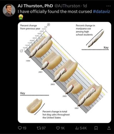 So to be clear: there is no correlation between weed use and hotdog use, other than that they’re both in decline. This means that they created this graph showing two unrelated datasets for no reason other than that they could. Or, maybe, because they wanted to use the cursed image of a spliff in a hotdog bun.