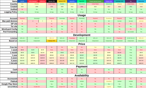If you’re going to be giving out advice, you should at least know that Mozilla VPN is rebranded Mullvad VPN. So most of the information on your chart should be exactly the same for both.