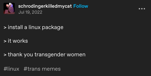 minus-squarekaty ✨@lemmy.blahaj.zonelinkfedilinkarrow-up1·2 years ago> hate ur job > follow the white rabbit > escape the matrix > thank you trans woman