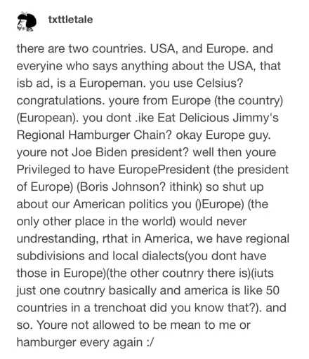 there are two countries. USA, and Europe. and everyine who says anything about the USA, that isb ad, is a Europeman. you use Celsius? congratulations. youre from Europe (the country)(European). you dont .ike Eat Delicious Jimmy’s Regional Hamburger Chain? okay Europe guy. youre not Joe Biden president? well then youre Privileged to have EuropePresident (the president of Europe) (Boris Johnson? ithink) so shut up about our American politics you ()Europe) (the only other place in the world) would never undrestanding, rthat in America, we have regional subdivisions and local dialects(you dont have those in Europe)(the other coutnry there is)(iuts just one coutnry basically and america is like 50 countries in a trenchoat did you know that?). and so. Youre not allowed to be mean to me or hamburger every again :/