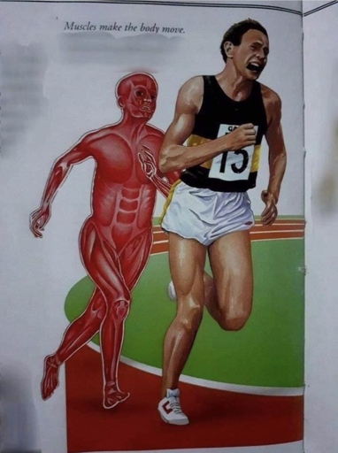 Hopefully the muscle man is just muscle. Otherwise he risks injuring his knees by overstriding like that.