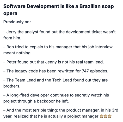 arrow-up146imageSoftware Development is like a Brazilian soap operalemmy.mlcm0002@mander.xyz to Funny@sh.itjust.works · 8 days agomessage-square0linkfedilink