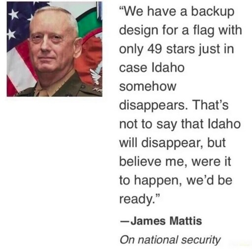 people don’t understand that the DOD has had decades to create op plans for damned near every potential situation. so fuck yeah idaho, but also, florida or oklahoma rebelling, vermont being taken over by genetically modified bears, or even people in Nevada waking up and suddenly realizing they live in a godforsaken hell hole. There’s a plan for them all.