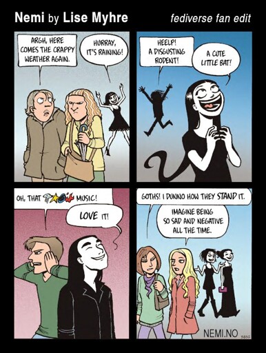 • Added the name of the strip and artist. I think the artist deserves a much higher profile in the US than she currently has. The line art of the goths in panels 2 and 3 is masterful, and the background goths in panels 1 and 4 show a perfect balance of minimalism and detail. Tellingly, the non-goths all look like caricatures of actual people rather than just generic cartoon characters. Importantly, this particular strip isn’t just going for a gag, it also aims to expess a truth about “dark culture” and its relationship to the world. Anyway I think the name of the cartoon and its artist deserves to be prominently placed on the image; this isn’t usually done on the images floating around the internet. (they often have the “nemi.no” url, but this forwards to a facebook page which doesn’t even mention the artist, and which only shows 2-3 entries before refusing to do any more unless you make a facebook account.)