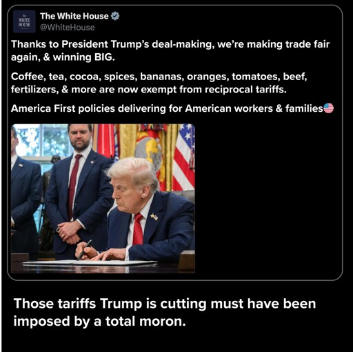 Team Trump took the US trade deficit with each country, divided it by our exports, and called that a “tariff” being imposed by the trading partner. They then imposed “reciprocal tariffs” of 50% of that trade deficit, with a minimum of 10%. It is shockingly stupid from a regime known for shocking levels of stupidity.