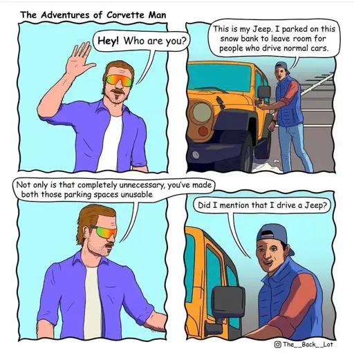 I understand that cops are going to be happy to pull over a Corvette. But you can still go the speed limit. And you don’t have to cruise under the speed limit in the middle lane… Basically, he’s the kind of driver that irritates me.