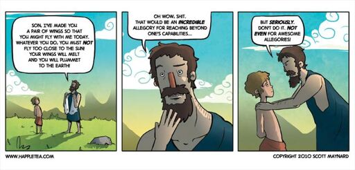 Daedalus murdered his son and blamed his son’s “ambition” to cover it up. It doesn’t get hotter as you rise, it gets colder. If the wax melted, it was due to shoddy craftsmanship.