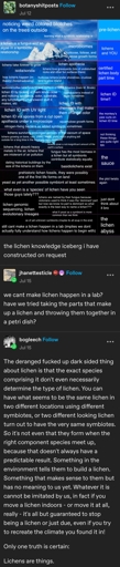 The deranged fucked up dark sided thing about lichen is that the exact species comprising it don’t even necessarily determine the type of lichen. You can have what seems to be the same lichen in two different locations using different symbiotes, or two different looking lichen turn out to have the very same symbiotes. So it’s not even that they form when the right component species meet up, because that doesn’t always have a predictable result. Something in the environment tells them to build a lichen. Something that makes sense to them but has no meaning to us yet. Whatever it is cannot be imitated by us, in fact if you move a lichen indoors - or move it at all, really - it’s all but guaranteed to stop being a lichen or just due, even if you try to recreate the climate you found it in!