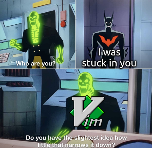 Waffelson@lemmy.world to linuxmemes@lemmy.world · 2 years agoHow did you get out of Vim before you knew its hotkeys and commands?lemmy.worldimagemessage-square1linkfedilinkarrow-up11
