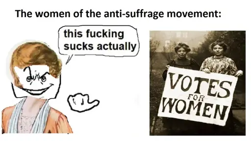 PugJesus@piefed.socialM to History Memes@piefed.socialEnglish · 12 days agoIt's really astounding how many anti-suffrage women there weremedia.piefed.socialimagemessage-square2linkfedilinkarrow-up147