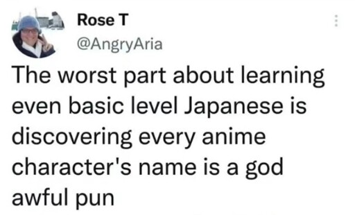 Yet another reason to be happy about not being a fucking weeb: If I ever learn Japanese I won’t know any anime names to realise this.