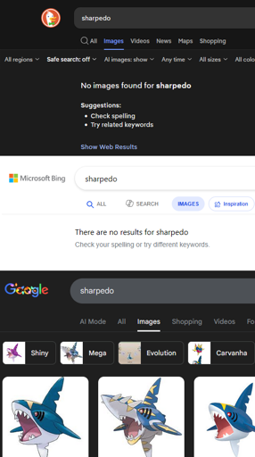 I found also typing “sharkpedo” works. Still doesn’t explain why Google behaves but DDG doesn’t.