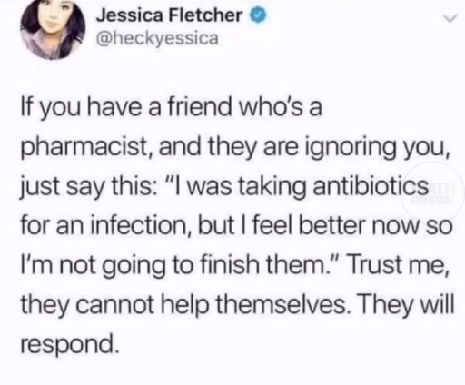 As a joke it’s perfect 😂 but also: please don’t actually do this—finishing antibiotics as prescribed (or calling your doc if you’re having side effects) is the real pro tip.