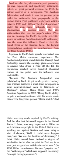 From the book: “Henry Ford was, of course, the man most responsible for inaugurating mass production of the automobile—the man who refined the car as the ultimate expression of American consumer culture. He was also a man who had some exceptionally repellent ideas about “bloodlines.” As Jonathan Greenblatt of the Anti-Defamation League said on Twitter at the time of Trump’s remarks, “Henry Ford was an antisemite and one of America’s staunchest proponents of eugenics”