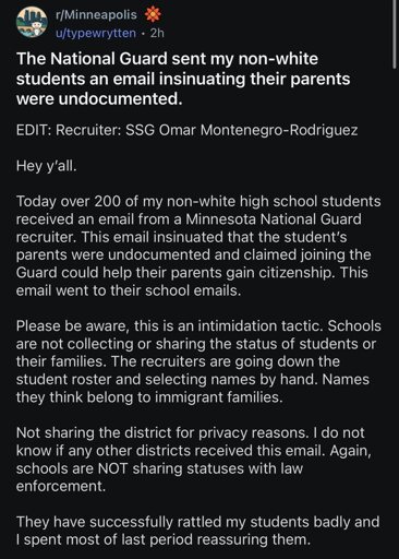 arrow-up1313external-linkThe Minnesota National Guard is attempting to recruit high school kids by insinuating their parents might be deported if they don't sign uppbs.twimg.comdestructdisc@lemmy.world to A Boring Dystopia@lemmy.world · 10 days agomessage-square12linkfedilinkfile-text