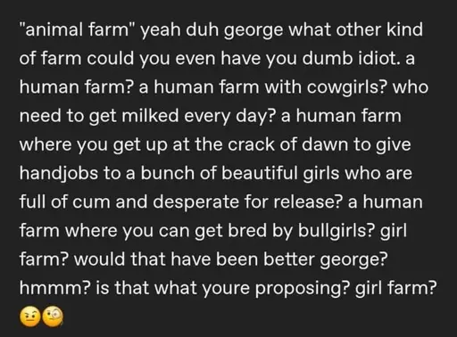 NSFWtranscription: “animal farm” yeah duh george what other kind of farm could you even have you dumb idiot. a human farm? a human farm with cowgirls? who need to get milked every day? a human farm where you get up at the crack of dawn to give handjobs to a bunch of beautiful girls who are full of cum and desperate for release?> a human farm where you can get bred by bullgirls? girl farm? would that have been better george? hmm? is that what you were proposing? girl farm?