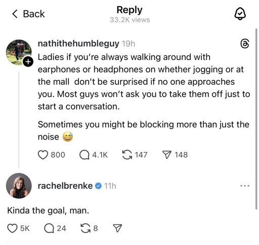 Edit: my personal experience is I had 2 different guys tap on my shoulder and ask me to remove my earbuds by gesturing. Both times they were trying to pick me up. I was just on the way home from work, exhausted and also heavily married.