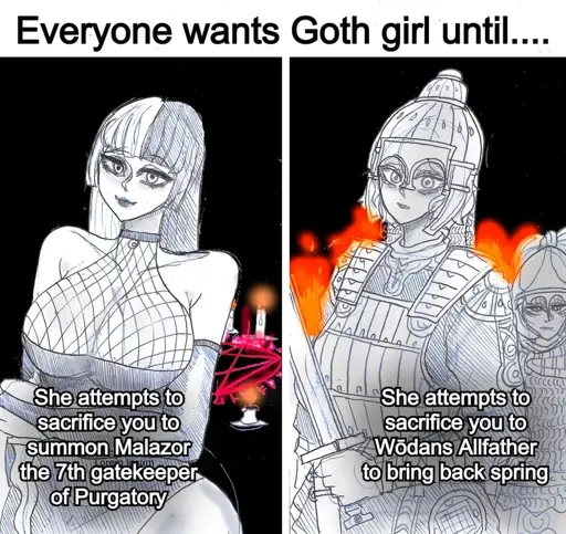 Personally I’m more of a Satanist so profane sex rituals on a pentagram inscribed into hallowed ground is more my style but there’s plenty of blasphemy to go around. Left Goth Girl is probably more my speed but I’m happy to play sacrificial lamb for whatever flavor of Goth Girl presents herself.