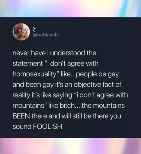 Homosexuality isnt an action its a characteristic. “I dont agree with recycling” is different than “i dont agree with being left handed”.