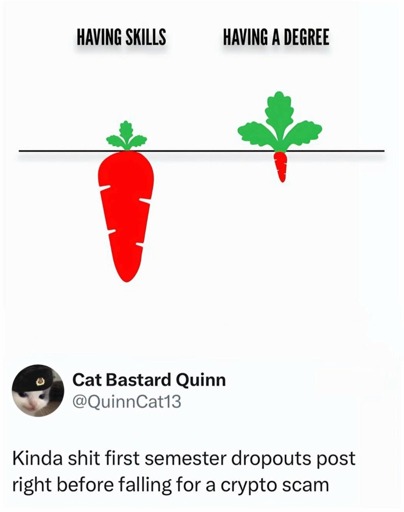 The carrot thing isn’t totally untrue, but it’s a bit more complex. If you’re skilled in a trade, you probably have more of a chance of not being financially uprooted than someone with a white collar degree whose job will be AI’d in the next 5 years. That said, to make decent money in a trade, it helps a lot to have a degree from a trade school.